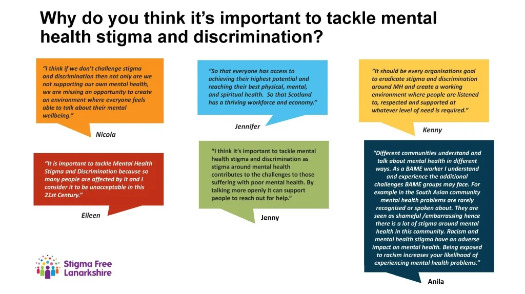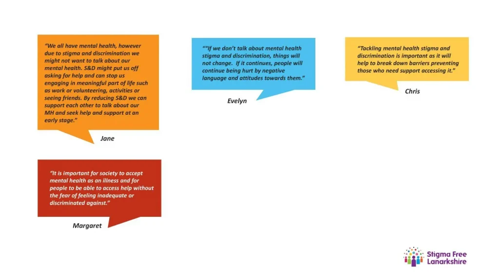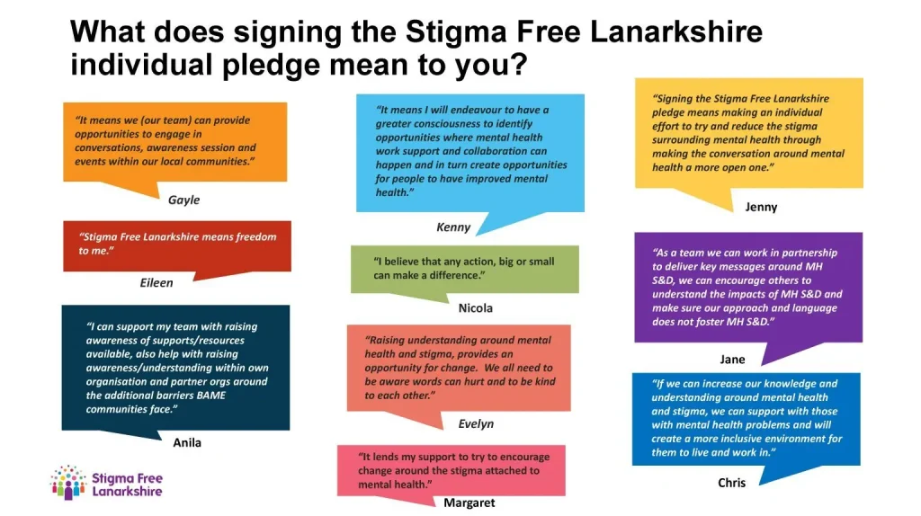 The main reason for stigma is a lack of understanding, so the more we talk openly and compassionately about mental health, the more we will create a safe space for barriers to be broken down. When others open up, we can listen and respond without judgement. So the champions have encouraged colleagues to sign up the Stigma Free Lanarkshire’s individual pledge to do just that and join a movement for change where individuals take small yet powerful action for collective impact.